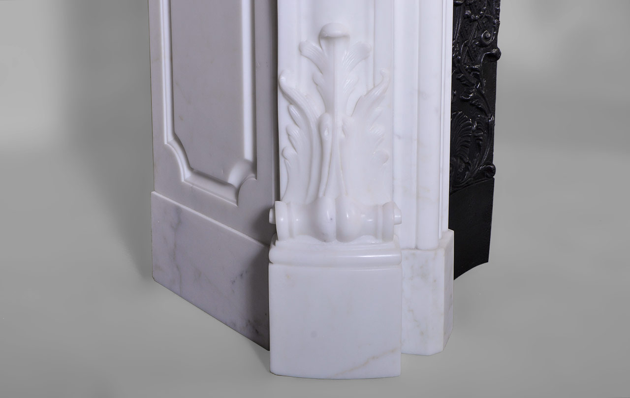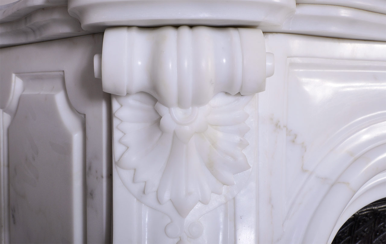 Louis XV style, the carved decoration of this fireplace is extremely elaborate. A large reversed foliaged shell adorns the center of the frieze. Jambs are curved and have a winding lined with fleshy acanthus leaves in the lower part. The top of the jambs are ornated with carved shells and bells fall.