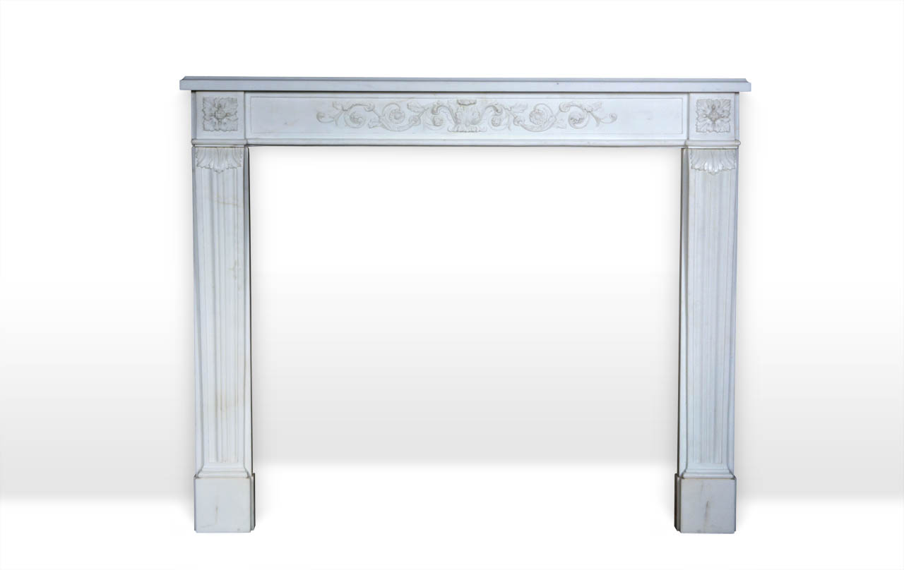 "Marquis de Condorcet" is a custom-made Louis XVI style marble fireplace mantel delicately carved in low relief.