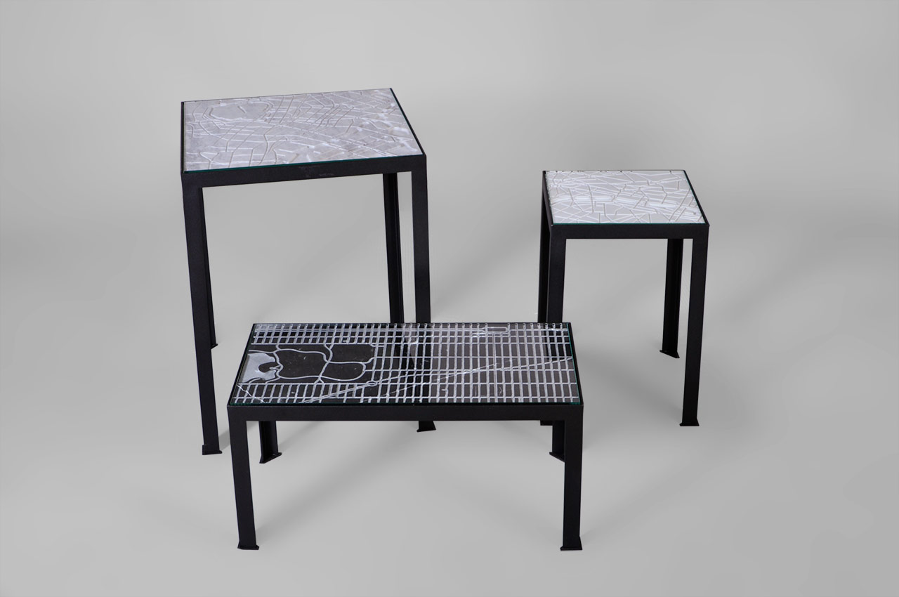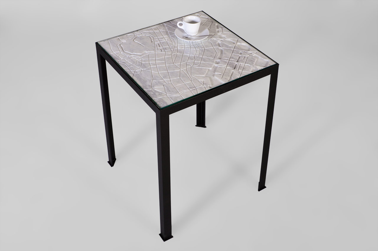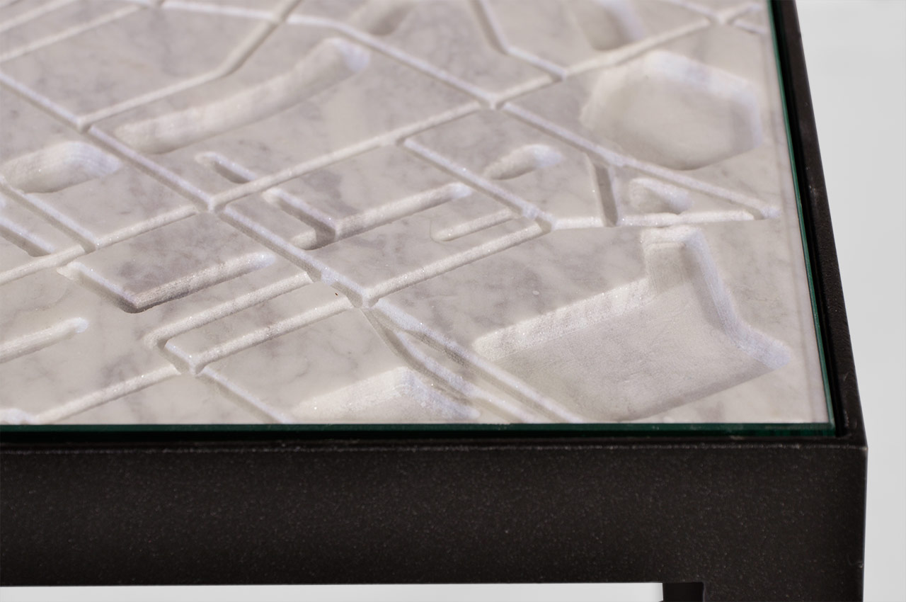 The "City" collection draws its inspiration from maps and layouts of the busiest cities in the world. Marble lends its texture and contrasts to highlight the main areas of the cities. Engraved marble is protected with a glass sheet that fits perfectly with the steel base while remaining lightweight. Several cities show how urban structure evolves. "Tokyo" is the perfect combination of old-world and modern styles. Starting out from the former center of the megalopolis, built around the castle and its moats, the new city - more organized and stretching out perpendicularly - gradually creeps toward the sea with each extension.