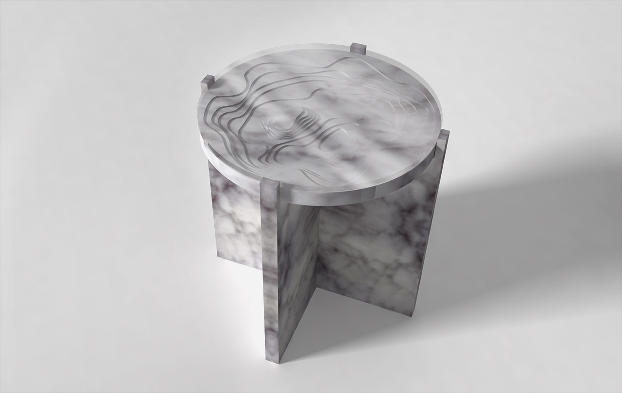 The "Geo" collection is inspired by geographical zones, with stylized table tops designed to resemble real topographical maps. Various regions of the globe are represented as such in marble through relief and contrasts between rough and polished finishes. "Sud" represents regions with subtler differences in levels with milder, controlled volumes. An illustration of controlled contrast, "Sud" offers a marble carving that nonetheless includes discernible variations in levels. This piece is available either as a side table or as a wall light.